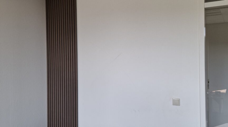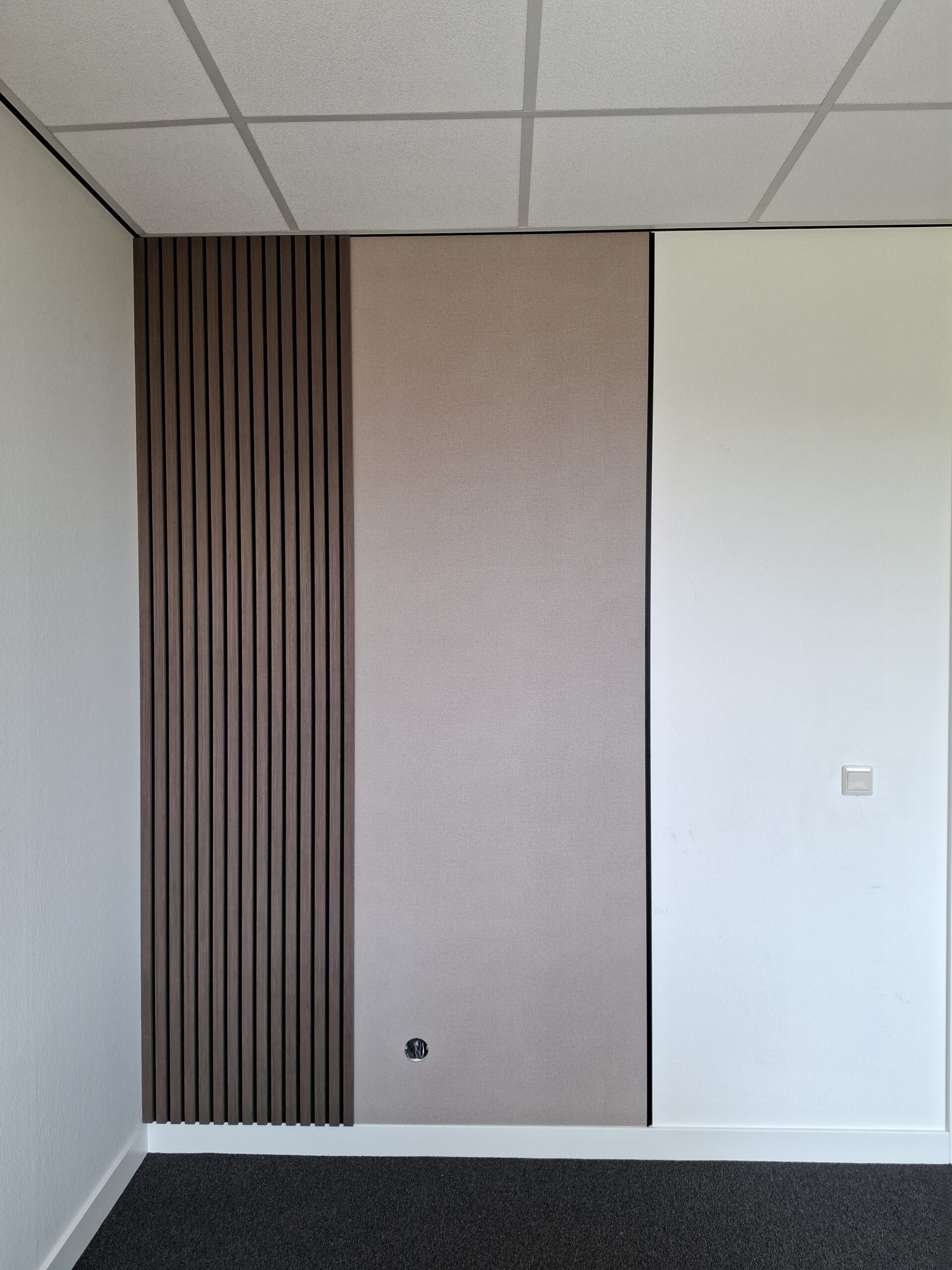 Om de kantoorruimte extra warmte en diepte te geven, hebben we de Japansestof panelen gecombineerd met de Walnut akupanelen (302 JK). Deze houten panelen versterken niet alleen het natuurlijke karakter van de ruimte, maar verbeteren ook de akoestiek. Dat maakt de werkplek comfortabeler en draagt bij aan meer rust en concentratie.