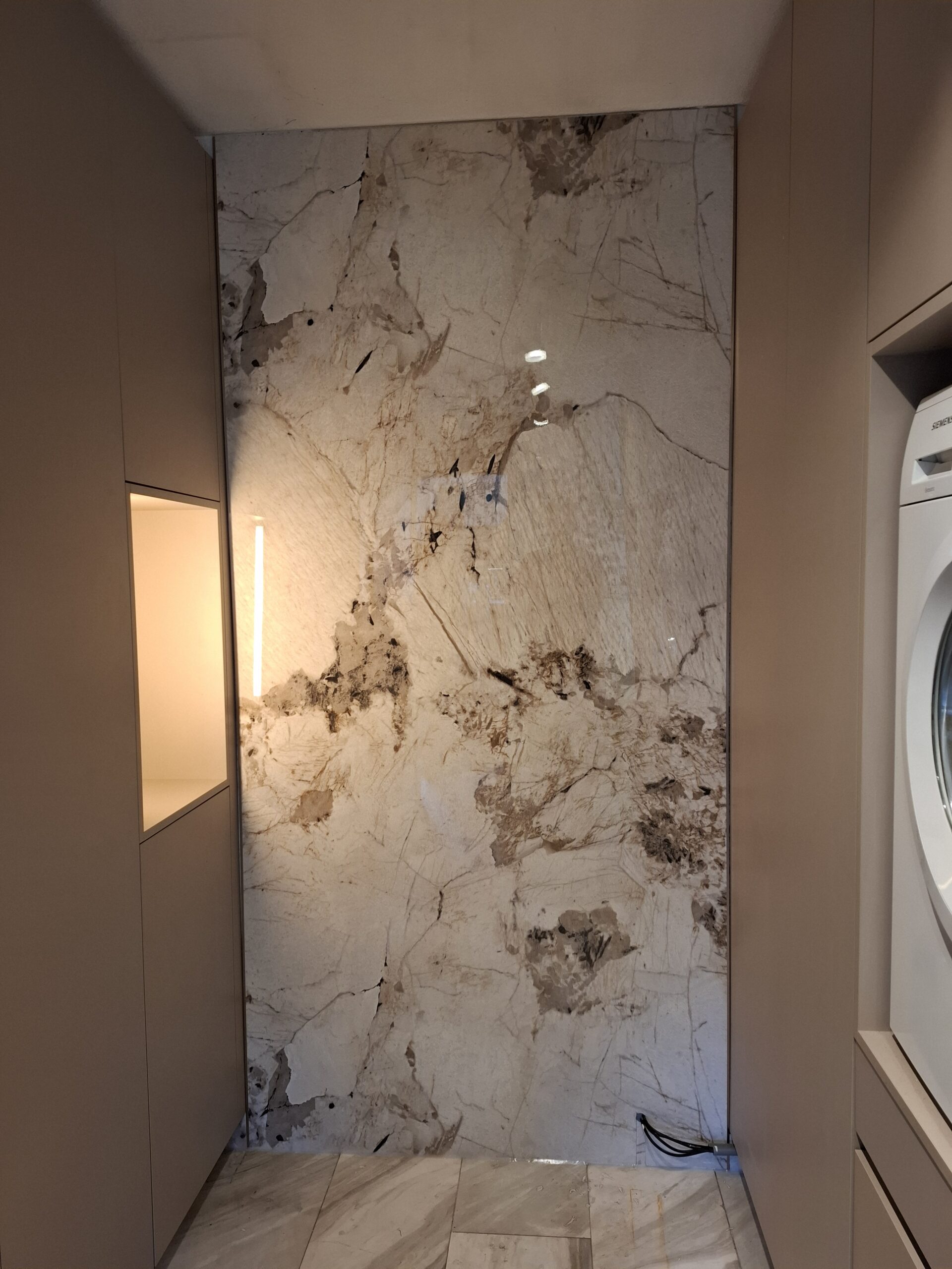 Dankzij de glanzende marmerlook afwerking straalt de keuken nu luxe en klasse uit. De lichte glans zorgt voor een ruimtelijk effect en de panelen zijn eenvoudig schoon te maken – ideaal voor een ruimte waar dagelijks wordt gekookt en gewerkt.